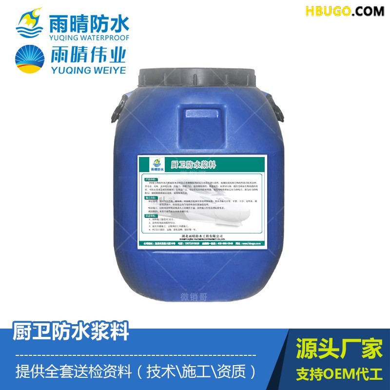 厨卫防水浆料(厨卫专用)是一种由以优质改性丙烯酸共聚乳液和多种添加剂组成的有机液料,再以特种水泥及多种填加剂组成的无机粉料,经科学配方加工制成的双组份水性防水涂料。涂刷之后形成的防水膜,具有优良的耐水性、粘结性和抗渗性。